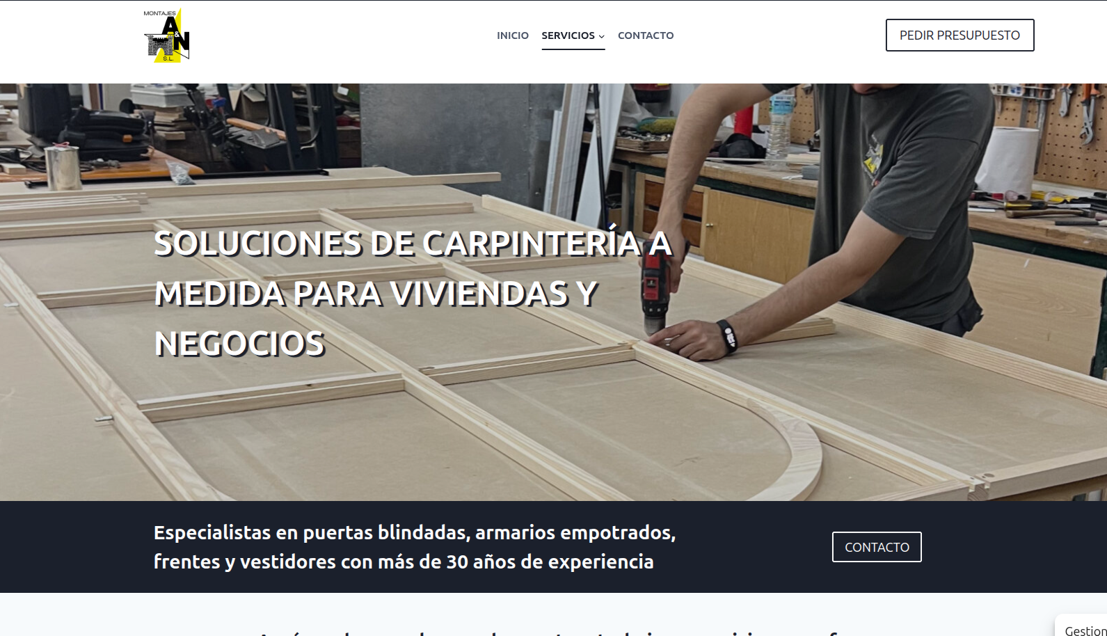 El diseño web para carpintería en Madrid realizado para A&N Montajes se construyó pensando en la esencia del oficio y en cómo trasladar el cuidado del trabajo manual al entorno digital. La página debía reflejar la calidad y la dedicación detrás de cada proyecto, desde escaleras y hornacinas hasta mesas macizas o baldas personalizadas.