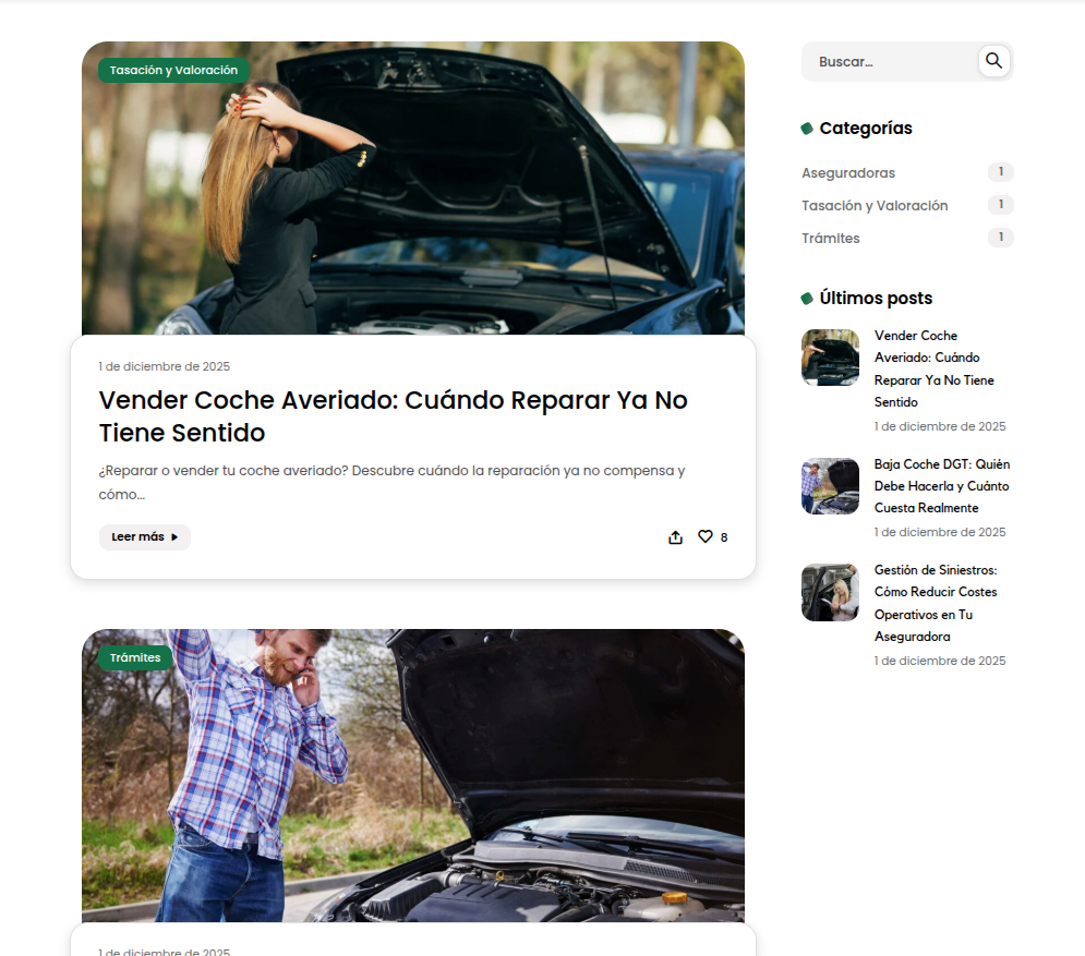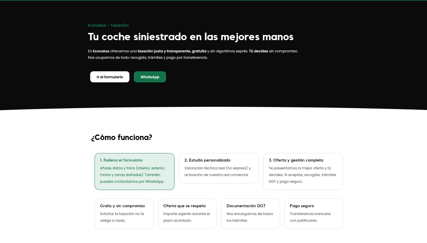 - Estructura preparada para posicionamiento SEO en búsquedas relacionadas con tasación y venta de vehículos siniestrados.